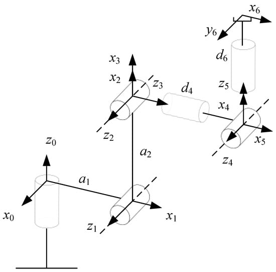 In this paper, we used the Zhichang Kawasaki RS010N robot as the research object. Figure 1 shows its structural configuration, and Figure 2 shows the configuration of its DH coordinates. The RS010N robot is a typical six-DOF industrial robot. Because the kinetic parameters of its three rear joints are much smaller than those of its three front joints, the former have a smaller influence on the accuracy of control of the robot’s motion. Thus, we considered only the first three joints of the RS010N industrial robot here [].