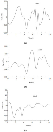 In Equation (1), τ denotes the driving moment, q denotes the vector of the position of the joints, and and denote vectors of the velocity and acceleration of the joints, respectively. D(q) denotes the inertial matrix, C(q,) denotes the Koch and centrifugal force terms, respectively, and G(q) denotes the gravitational force term [].