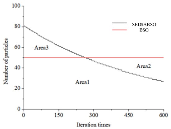 Figure 5 shows that the number of particles N was constant during iterations of the BSO algorithm. Assuming that the maximum number of iterations was Maxdt and the duration of iteration of each particle was t, the total duration of iterations of BSO was N∗Maxdt∗t, and N∗Maxdt is equal to Area1+Area2 in the figure. For the SEDSABSO algorithm, the total iteration time was approximately the product of Figure 5. For the SEDSABSO algorithm, the total iteration time was approximately the product of the area of the class trapezoid enclosed by the dash and the horizontal axis and the time t, i.e., (Area3 + Area1) ∗ t, and since the area of Area3 was not much different from that of Area2, the computational complexity of the improved Amanita group algorithm was approximately the same as that of the standard Amanita group algorithm.