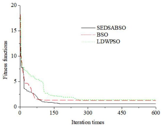 From Figure 6, we can see that the SEDSABSO algorithm proposed in this paper converges faster and has smaller fitness values than the BSO and LDWPSO algorithms. It is clear that the SEDSABSO algorithm proposed in this paper performs best.