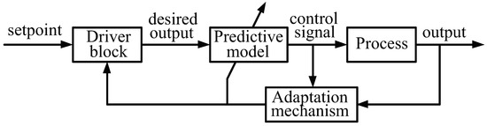 The Driver Block (DB) calculates the trajectory that guides the controlled variables to their references in an optimal way, based on the driver block equation [5,19]. The Predictive Model (PM) computes the control signals at every instant k; its objective is to lead the process output to meet the desired trajectory estimated by the DB. The predictive model will estimate the process output to calculate the prediction error every instant k using the estimated ARX model parameters at the instant k and the applied control signal . The ARX equation described in the predictive model is, at the beginning, an approximation model based on the process knowledge; this equation will be adjusted by the Adaptation Mechanism (AM), which will adjust the predictive model’s parameters based on prediction error until this tends asymptotically towards zero [20]; simultaneously, the current value of the values under control will feedback to the DB through the AM.