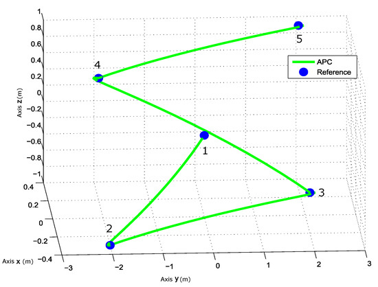 The first test consists of a tracking experiment of four points in a 3D space. In this way, the drone will simulate free flight-path control. This test is used to evaluate the performance of the proposed MIMO-APC, described in Section 3. The result obtained from this test for a prediction horizon is shown in Figure 2. This result indicates that a better reference tracking can be achieved using the MIMO-APC controller proposed in this paper in comparison with the multiple SISO controller implemented in [22].