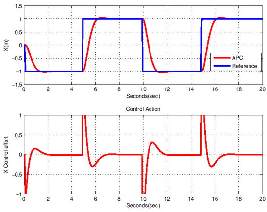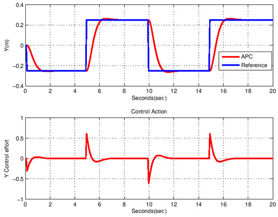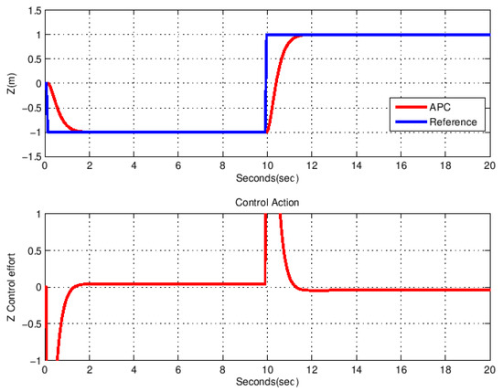 Now, in order to have a better comparison of both controllers, the performance of all degrees of freedom are analyzed separately. Figure 2 shows the performance of the proposed MIMO-APC controller according to translational movement changes in the x, y and z axes. Notable improvements were achieved using the proposed MIMO-APC. Figure 3 and Figure 4 show a reduction of the settling time for the translation movement in axes x and y respectively, and the saturation time has decreased in comparison with the results presented in [21,22]. Figure 5 shows the performance of the elevation controller (z) where a reduction of the settling from 4 to 2 s and the saturation time for the control action can be observed. In both cases, a desired behavior without overshoot is presented.