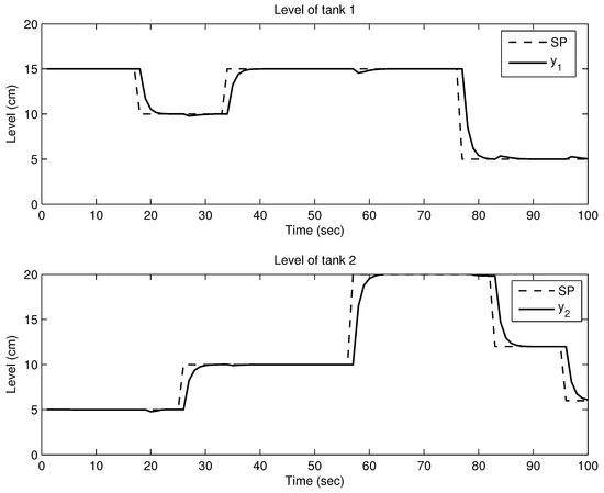The first part of the experiment consists of adjusting the flow valves so that the system behavior is its minimum phase. In this case, the value of has been changed from 0.7 to 0.6, in online mode (30 s). Based on this change, it is necessary to update the model parameters with the adaptive mechanism and to adjust the MIMO-APC settings. Figure 7 and Figure 8 show the performance of the MIMO-APC for the system operating in both minimum and non-minimum phases. Figure 7 shows that the level controllers closely follow the set points with the exception of a 13% overshoot in the tank A2 response, while Figure 8 illustrates very close set-point tracking throughout the experiment.