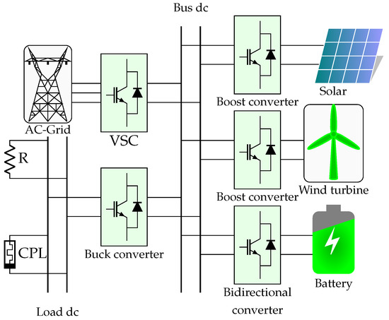 Recent advances in power electronics from high- to low-power voltages for direct current (DC) applications make owning DC distribution networks in medium and low voltage levels with high levels of efficiency possible [1,2]. Since DC distribution does not require reactive power and frequency concepts to operate, energy losses are inferior in these systems when compared with its traditional alternating current (AC) counterparts [3]. Generally, a DC microgrid can be composed of multiple devices interconnected to the main regulated bus [4,5], which include renewable generation, batteries, linear loads (i.e., resistances), and constant power loads, requiring specialized controllers to ensure a stable operation in a closed-loop [6,7]. The interconnection of these devices is executed with power electronic converters that allow the controlling of each device into their operative range, ensuring secure working. Some of the most conventional converters for DC microgrid applications include buck [8], boost [6], buck-boost [9], non-inverting buck-boost [10], and Cuk converters [11]. The main characteristic of these devices is that, usually, due to the presence of commutated devices inside of their electrical circuits, they generate nonlinear dynamic models that complicate the usage of classical linear controllers such as PI (Proportional-Integral) and feedback designs [10,12].