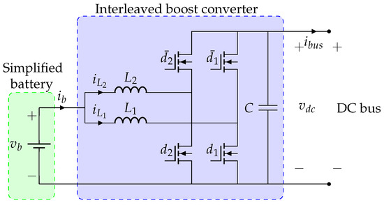 Figure 2 illustrates the interleaved boost converter, where and are the battery voltage and current, and are the currents through the inductances, and is the capacitor voltage. The parameters , , and C are the two inductances and capacitance, respectively. The duty cycles control the states of the converter and are their negative values. The control objective in this paper corresponds with the voltage support in terminals for positive and negative variations of the input current (charging/neutral/discharging operative conditions on the battery). The currents through the inductors must have the same values to balance the operation of the converter and, thus, lead to a decrease in the ripple of current waveforms through the converter.