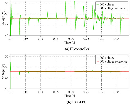 Figure 8 depicts the output voltage of the interleaved boost converter under different voltage DC references. Figure 8a,b show the output voltages of the interleaved boost converter when the conventional PI and IDA-PBC controllers are implemented.