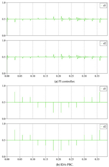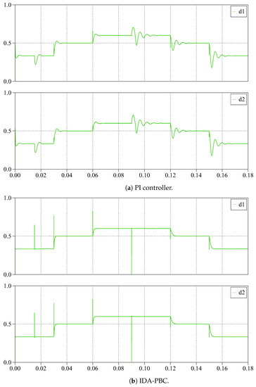 Figure 10 depicts the control inputs for the proposed controller and PI control when the interleaved boost converter is under different DC voltage and current steps. For both controllers, the control inputs do not overshoot their limits. The voltage output dynamics depict the same behavior as that of the control inputs, implying that the voltage output response is directly proportional to the control inputs.