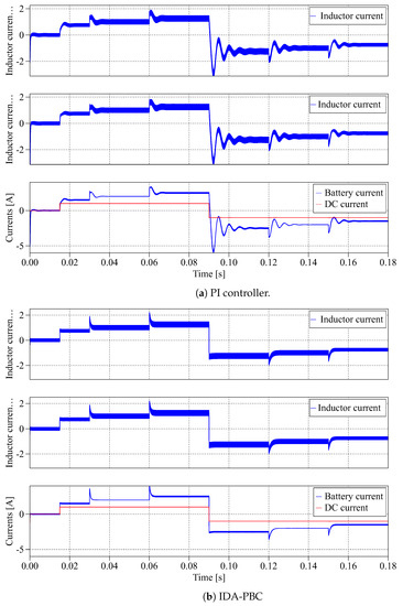 Figure 9 illustrates the currents associated with the interleaved boost converter. The currents in both inductors, DC bus and battery, are displayed in Figure 9a,b when the conventional PI and the IDA-PBC controller are implemented.