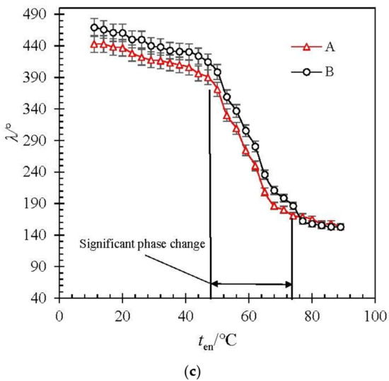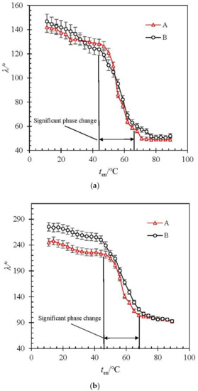 In Figure 5a, the angular displacement of curve A decreases from 142° to 49°, and that of curve B decreases from 147° to 51°. The significant change stage of angular displacement is from 47 °C to 64 °C. In Figure 5b, the angular displacement of curve A decreases from 245° to 93°, and that of curve B decreases from 275° to 91°. The significant change stage of angular displacement is from 48 °C to 69 °C. In Figure 5c, the angular displacement of curve A decreases from 433° to 150°, and that of curve B decreases from 469° to 152°. The significant change stage of angular displacement is from 46 °C to 75 °C.
