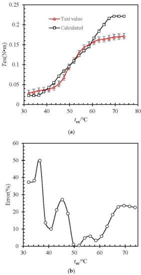 - The initial temperature of the water bath was set at 30 °C (lower than As), and the temperature is raised at 2 °C/min. The values of ten and Tex of the water bath are recorded. The values recorded in the test are compared with those calculated by Equations (33) and (34), and the results are shown in Figure 6.