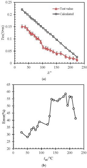 Figure 6. Relationship between torque and excitation temperature. (a) Test value and calculated, (b) error between test value and calculated.