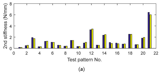 Figure 14, Figure 15 and Figure 16 show the results of predicted yield displacement, first stiffness, and second stiffness of the SCD using ANNs. The blue bar graph in Figure 14a shows the target yield displacement for 21 patterns, and the yellow bar graph represents the yield displacement predicted by the ANN1. Figure 14b exhibits a bar graph showing the prediction error for 21 patterns, which had a maximum error rate of 7%. Figure 15 and Figure 16 show the result and error for the first stiffness and second stiffness predictions, respectively.