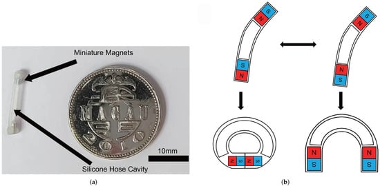 Physical prototype and illustration of the working principle of the MHCMM. (a) The main structure of the MHCMM is composed of two miniature magnets at the two terminals and a silicone hose cavity in the middle. (b) The magnetism at the end of two magnets can be controlled to perform different functions. When the poles at both ends of the MHCMM are tuned to be the same polarity, an arch shape can be produced by applying an external gradient magnetic field. When they have different polarity magnetic poles, a circumferential shape can be generated.