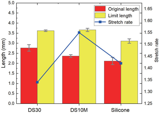 Due to the material property, only three of the five materials can be used to produce the prototype of the MHCMM. The adopted materials and their properties are shown in Table 1. The other two materials (E610 and E630) are not feasible because they are too viscous, which has a negative impact on forming cavities. For each of the three MHCMM samples, after fabricating the MHCMM sample with a length of 20 mm, it was stretched by increasing the distance between two magnets at the terminals. The original and maximally deformed lengths were measured for each stretch. The experiment was repeated six times, and the experimental results are shown in Figure 3. We can observe that the silicone material of Dragon Skin 10 Medium provides the best tensile property, which is stretched about 1.55 times on average.