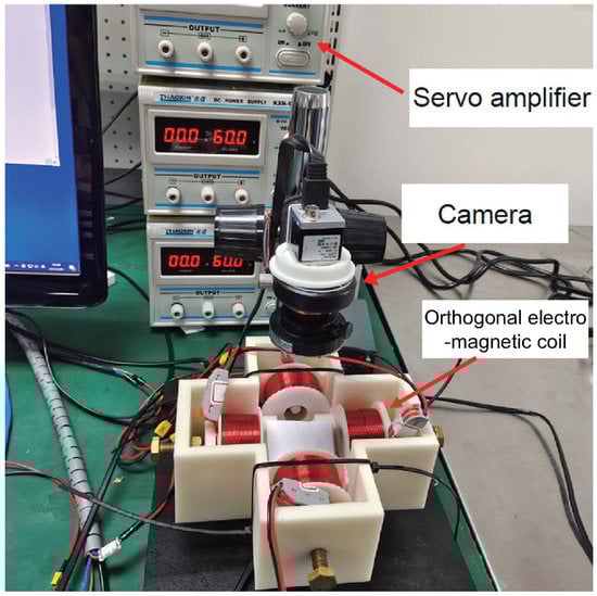 For the experimental study, we adopted a magnetic driving system that consists of a three-axis orthogonal electromagnetic coil device, a tube vessel (35 mm diameter) containing the millirobot, a top camera, and a side movable camera, as shown in Figure 4. A triaxial electromagnetic-coil actuation system generates the oscillating magnetic field, with each of the three orthogonally arranged coils driven by a servo amplifier (KXN-6020D DC, from Zhaoxin Inc., Shanghai, China). The amplifier was controlled via a digital I/O board by a developed LabVIEW program (National Instrument Inc., Pinehurst, NC, USA) running on a personal computer.