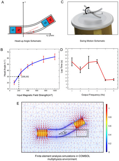 Head-up test and swing motion results. (A) The head-up angle of the MHCMM itself can be obtained by changing the input signal to the electromagnetic coil amplifier. (B) Experimental results of six sets of head-up angles versus input magnetic field strength. (C) A 3D schematic of oscillating forward motion with an electromagnetic coil underneath, which produces an oscillating magnetic field. (D) The electromagnetic coil, which has an output magnetic field strength of 300 mt, is controlled to produce an oscillating magnetic field of different frequencies, and the lap time is the time taken to make one revolution along a 35 mm diameter Petri dish. (E) The deformation of MHCMM under the action of an external magnetic field of strength 210 mT. The analysis result is consistent with the test result.