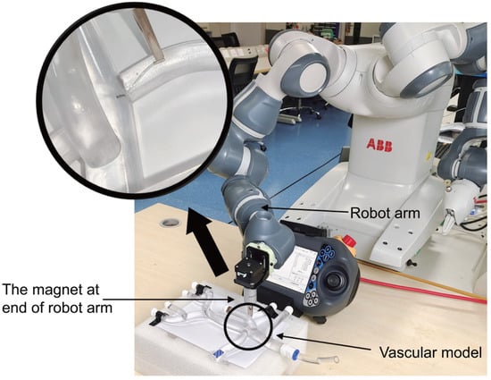After fabricating the MHCMM, we installed permanent magnets at the end of a robot arm (R14000 dual-arm robot, from ABB Ltd., Zürich, Switzerland) with custom-built parts (THREE-M 3D printer, from Wiiboox.net Inc., Nanjing, China). A model structure of human blood vessels was built and manufactured using transparent resin by 3D printing. The main parts of the aorta, renal artery, common skeletal artery, and superior mesenteric artery are involved in the 3D vascular model. In consideration of the plasma density of the human body [27], an aqueous solution of 30% glycerol was chosen for filling the 3D vascular model in the experimental study.