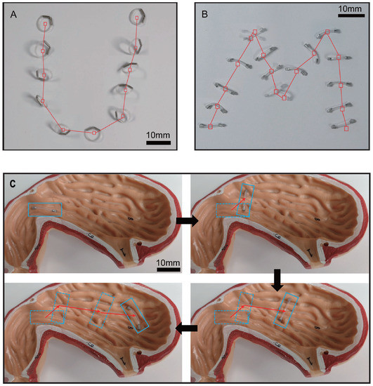 The multimodal motion of MHCMM. (A) The “U”-shaped trajectory by circular tumbling; (B) the “M”-shaped trajectory by the tumbling motion; (C) the MHCMM demonstrated the ability of the tumbling motion to cross obstacles by crawling by path in a human stomach model.
