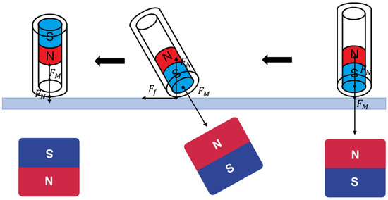 When manipulating the MHCMM with different polarities at both ends, the S-pole of the permanent magnet is initially placed in the positive Z-axis direction. This causes the MHCMM to remain standing at one end, along with an inclined angle for the other end. Ideally, the MHCMM should be purely vertical if the external permanent magnets are placed in the given position. In practice, the silicone material does not exhibit a uniform density, resulting in a slight bending deformation. This state is the result of several forces interacting together, such as the attractive force of opposite-pole magnets , repulsive force of same-pole magnets , and supporting force of materials , as shown in Figure 2A.