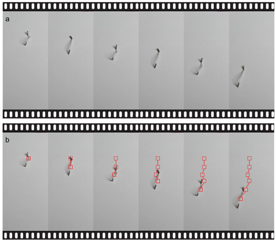 The worm-like motion and path of MHCMM. (a) By changing the distance of the external permanent magnet, the MHCMM with opposite magnet polarity at the end can perform a worm-like motion. (b) The path of worm-like motion of the MHCMM is marked.