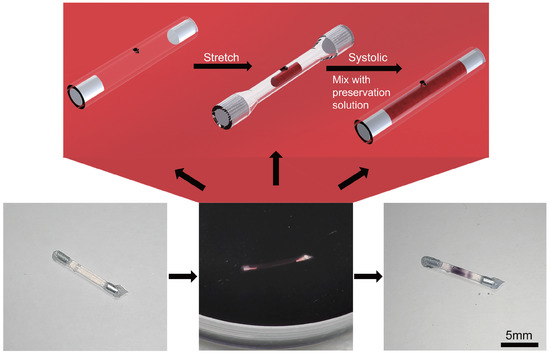 The cavity of the MHCMM makes it accessible to load more cargo, which provides a tool for in vivo biological sampling and drug delivery. To demonstrate this functionality, stretch sampling was performed. In particular, the magnets at both ends of the MHCMM were tugged by the permanent magnets in hand for executing the outward stretching motion. In this way, the volume of the internal cavity of the MHCMM was increased, leading to filling in the cavity with external ambient fluid. After the external ambient fluid is mixed with the preservation fluid in the cavity, the external magnetic field is removed, and the MHCMM retracts. We repeated this operation several times to ensure the presence of external ambient solution in the MHCMM cavity. The final measurement can reach 300–600 uL of liquid volume per sample, which completely encompasses the requirements of biological sampling for the number of cells. The scheme of the biological sampling process is presented in Figure 10. What is more, the MHCMM uses a sample sampling port similar to the principle of a heart valve manufactured by needle hole injection, and the external pressure will effectively reduce its loss of internal cargo. In addition, if the MHCMM is loaded with drugs, we can also achieve targeted drug transport through the liquid exchange in the cavity.