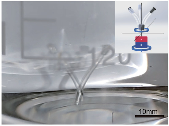 For testing the stirring function of MHCMM, we regulated the external permanent magnet by hand to form a rotating permanent magnetic field. The experiment was conducted by using a double-ended anisotropic magnet MHCMM. According to a preliminary experiment, a double-ended magnet with a different polarity MHCMM easily forms an upright shape, which is suitable for stirring, as shown in Figure 11. We performed finite element analysis simulation by COMSOL software. The results demonstrate that with the same motion velocity, the string structure contributes more to the induced flow field, as shown in Figure 12. Whereas a double-ended magnet with the same polarity as MHCMM will exhibit an arch-like shape under the attraction of an external permanent magnet, which affects the stirring function. Driven by an external magnetic field, the MHCMM exhibits the function of stirring in water. According to this function, we can make the drug diffuse faster in the human body.