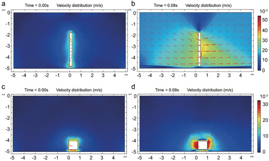 Simulation results of flow induction by the MHCMM. (a) The initial state (at 0 s) of the millirobot with the string structure is denoted by the slender square. (b) At 0.08 s, the slender square moves with a velocity of 3.0 cm/s. In the simulation, the total areas of the slender square and the flat square are identical. (c) The initial state (at 0 s) of the millirobot with normal structures, which are denoted by flat squares. (d) At 0.08 s, the squares move with a velocity of 3.0 cm/s.