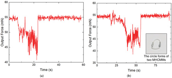 Microforce measurement result of circular MHCMM. (a) One ring is measured with the microforce measurement instrument for determining the tensile force, which can be released under constant magnetic field traction; (b) microforce measurement results with two MHCMMs, which provides an indication for the next step study of cluster control.