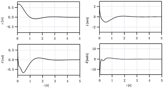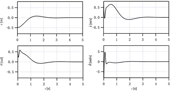 The simulation results under the above conditions are shown in Figure 4. It is clear that our method can still achieve the robust stabilization of the TORA. The settling time is less than 4 s. In contrast, the settling time in [21] is about 25 s. This shows the advantage of the presented method in this paper. In addition, the method presented in [21] is only applicable to the system with matched disturbances. In comparison, our presented method is applicable to the system with both matched and/or mismatched disturbances. Thus, our method has a wider application range than that in Ref. [21].