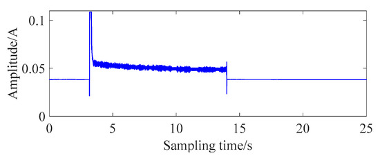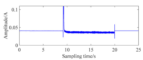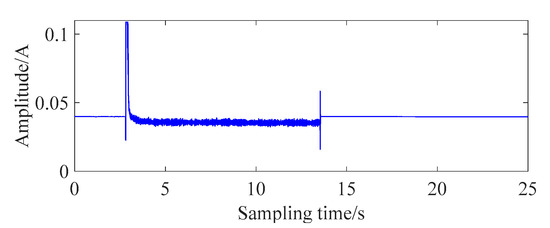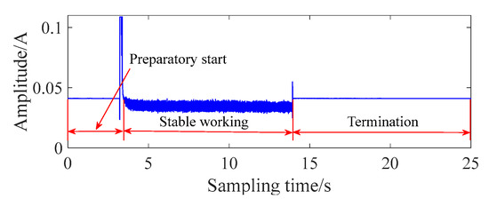 The working-current signal of the normal grille controller was collected through the circuit, and the time domain of the signal is shown in Figure 2. According to Figure 2, the working process of a normal grille controller can be divided into three parts. About 3 s after sampling is the preparatory start phase. The stable working phase lasts about 11 s, falling between 3 and 14 s. After 14 s, the termination phase is obtained. In the preparatory-start phase, the grille controller is driven by the power supply. The motor rotor and reduction gear start to rotate from the rest phase. A large motor current is required to satisfy the starting torque at this stage. When the final output gear starts to rotate, the required torque is reduced due to the inertia of the plastic gear group. The amplitude of the current is significantly smaller than in the preparatory start stage. While the final output gear reaches the predetermined position, the control task of the grille controller is over. At the termination phase, the circuit current is still maintained and the amplitude of current is consistent with the preparatory-start stage.