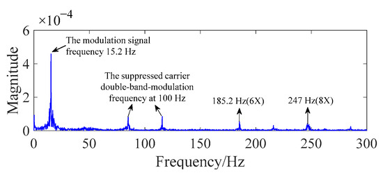 Figure 3 displays the spectrum of the working-current signal of the normal grille controller. The spectrum includes the modulation-signal frequency (15.2 Hz), the multiplier frequencies of the motor-rotation frequency (30.9 Hz), and the suppressed carrier double-band-modulation frequency at 100 Hz. In addition, the motor circuit modulates the fault frequency, and both sides of the fault-frequency side band of frequency could be observed. By searching the appearance of the side band, one can intuitively determine whether a fault has occurred.