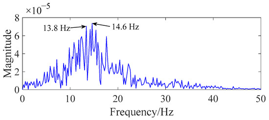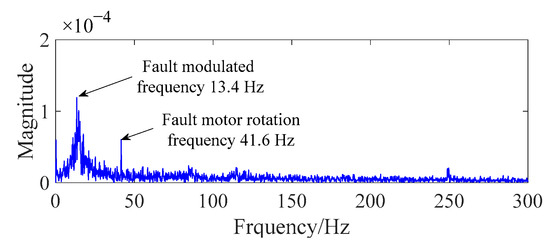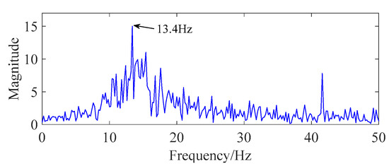 Based on the theoretical analysis results, the abnormal modulated-signal frequency could be obtained by the overload-current fault in the spectrum. The fault-modulated frequency (13.4 Hz), which is less than that of the normal grille controller, is observed in the spectrum, as shown in Figure 10.