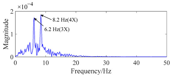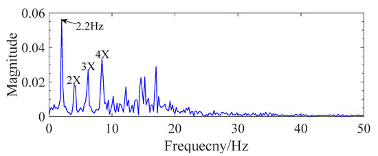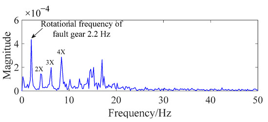 As shown in Figure 11, the rotational frequency of fault gear z4 (2.2 Hz) and its higher-order harmonics occur in the spectrum. The rotational-frequency fault is slightly greater than the normal value compared with Table 1. As a result, the rotational frequency of the fault gear could be an index for gear-scuffing fault in the frequency domain.