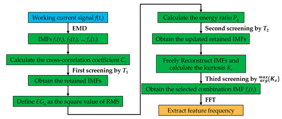 Let f(ti) be the working-current signal of the grille controller, where i = 0, 1,… N − 1, and N is the total number of sampling points. Then, let fj(ti) be the n-order IMF components of f(ti) obtained by EMD, where j = 1, 2,… n. Each IMF has a different energy and correlation with the original signal. The IMFs that are sensitive to the original signal-fault-feature information should dominate the energy, whereas the spurious IMF components have smaller energy. Therefore, the correlation coefficient and energy ratios are used as the basis for spurious IMF-component screening. In addition, the fault grille controller contains more impact components. Thus, the kurtosis index is also required as a basis for IMF reconstruction. The process of the improved reconstruction method of EMD is as follows: