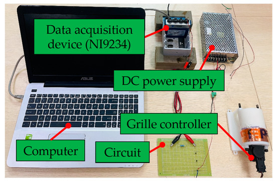 To illustrate the effectiveness of the proposed method, the acquired signals of the grille controller from the experimental platform shown in Figure 13 were analyzed. The experimental equipment comprises a DC power supply, a circuit, a data-acquisition device (NI9234), a computer, and a grille controller. The grille controller was inserted into a tool to simulate the embedded installation. The circuit consists of a series-connected push-button switch and a resistive voltage-divider circuit. The resistive voltage-divider circuit is the key to carrying out the non-invasive detection method. It is connected in series with a 47 resistor, and the working current of the grille controller is calculated by acquiring the voltage from the resistor-divider circuit. In this paper, the experiments were conducted on seven types of grille controllers, and the data were labeled as shown in Table 5. The sampling rate was 25,600 Hz, and the sampling time was 25 s.
