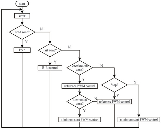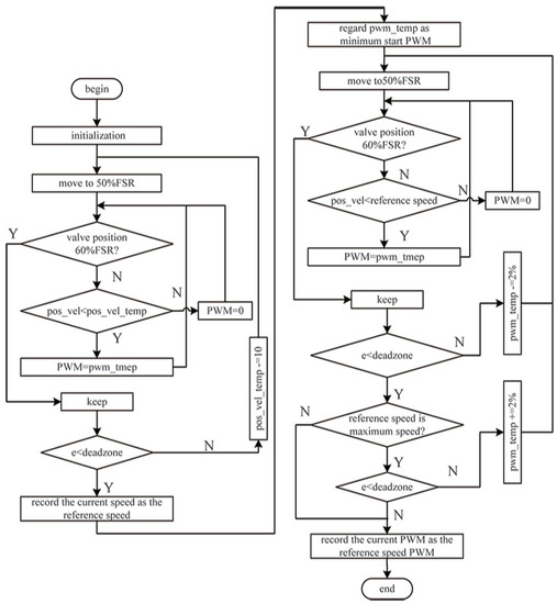 - When is less than the reference speed, the valve position enters the fine-tuning zone. It not only satisfies the constraint condition and , but also avoids the vibration of the valve position. With the minimum start PWM control, the PWM starts to decrease by 4%, and the lower limit is the minimum start PWM, which achieves the purpose of slowly entering the dead zone of the valve position.