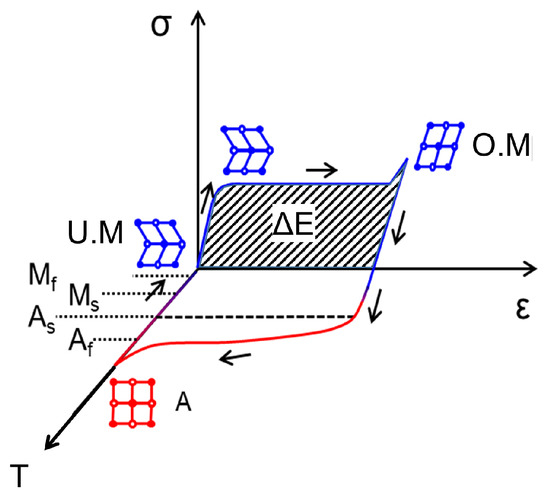Figure 1 illustrates the one-way shape memory effect using a qualitative stress-strain-temperature plot (--T). At ambient temperature under stress-free conditions (, = 0), the material is in the unoriented martensite state (UM), usually consisting of several martensite variants that self-accommodate to minimize strain energy. Reorientation of martensite initiates above the critical loading stress. Thereafter, the material undergoes a large deformation strain until the completion of martensite orientation. Upon unloading, most of the material deformation is retained. In this cyclic mechanical loading, a large portion of the loading energy is dissipated (). Subsequent thermal loading of the material is necessary for strain recovery. On heating above Af, the material transforms to austenite. The material returns to the UM state upon cooling below Mf. Owing to the high energy dissipation of one-way SMA under passive operation (i.e., without application of heating pulse) attributed to the pseudoplastic effect of martensite reorientation, this material is used here to develop our proposed hybrid damper.