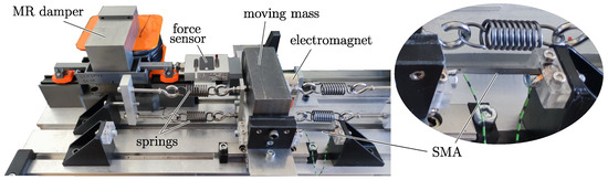 The test system consists of a mass of m = 2.53 kg connected to four springs with a total stiffness of (6.25 kN/m on each spring). This results in a characteristic time () of 62 ms for the oscillating system. The movement of the mass is guided along the x-direction using linear guides. The SMA bridges and MR damper are attached to the mass in parallel. Each end of SMA bridge is clamped between two blocks of Plexiglas. The shock loading is introduced using an electromagnet, which is installed on the right side of the mass at an initial distance of d. In this way, the exact same loading can be used repeatedly in the test system. The movement of the mass itself is then tracked using an OFV-3001 laser vibrometer from Polytec. The force of the MR damper is varied by changing the applied current. For the SMA, its state is initialized by a current pulse. Therefore, the SMA is connected to a current source and the current pulse is regulated by the control system. By analyzing the displacement of the mass for various damper states, the damping behavior of the hybrid concept can be investigated. An ADwin Pro-II is used to conduct both actuation and data acquisition in real time. A schematic of the test setup is shown in Figure 3.