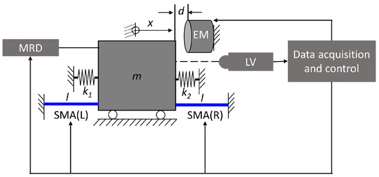Schematic of SMA-MR damper system test setup with vibrational system . Legend: m—Mass, EM—Electromagnet, LV—Laser vibrometer, MRD—MR damper, SMA (L,R)—SMA damper (left, right), —spring constants, l—unstrained length of the SMA damper device.