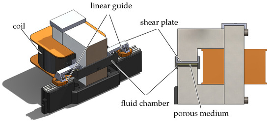 The magnetorheological fluid damper used for this investigation has a special feature. The construction is designed such that the damping force in the absence of the magnetic field is significantly lower than a conventional construction. This is achieved by using a special MR damper design in which the MR fluid is contained in a porous medium. Figure 4 shows the design of the constructed MR damper. As can be seen in the figure, the damper consists of an electromagnet (the configuration of the magnetic circuit is shown in the right figure), a fluid chamber, and a shear plate connected to linear guides. The electromagnet is separated from the shear plate to minimize the moving mass. In our first investigation, the iron core is constructed from three iron blocks. The geometry parameters of the MR damper are listed in Table 2.