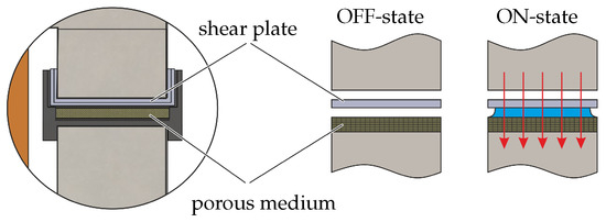 The MR damper uses the shear operating mode. The shear plate is intentionally installed with a gap of 0.5 mm to the surface of the porous medium, as shown in Figure 5.