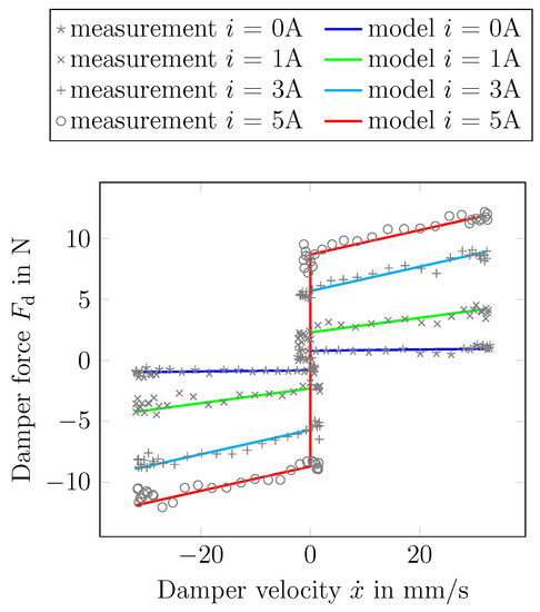 As in [16], using the shear operating mode of an MR fluid-based damper, Equation (1) can be transformed using the mechanical factors (operating area and gap width) into the relation between the damping force , the damper’s velocity , and the current i, as follows: