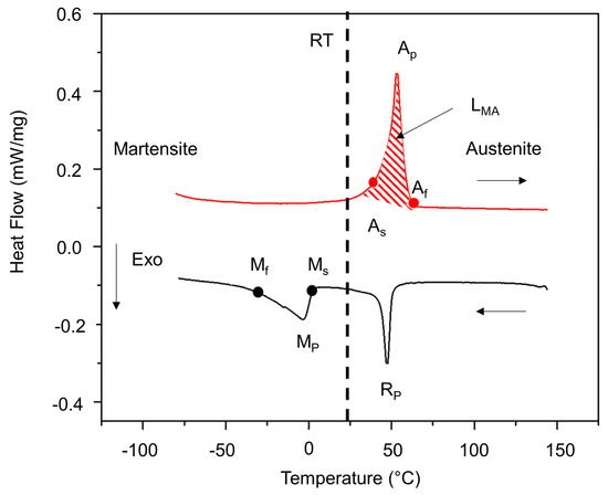 Starting from a 30 μm-thick cold-rolled Ni49.82Ti50.18 foil, the phase transformation temperatures are adjusted by heat treatment at 450 °C for 30 min to show a one-way effect at room temperature. Figure 7 shows Differential Scanning Calorimetry (DSC) measurements illustrating the phase transformation behaviour of this foil. The material undergoes one-stage transformation to austenite during heating and two-stage transformation from austenite to martensite through an intermediate R phase. The transformation temperatures can be determined as follows: As = 47.2, Ap = 54.2, Af = 59.1, Rp = 47.9, Ms = 2, Mp = −5.09 °C, Mf = −28.5 °C. The latent heat associated with the transformation from martensite to austenite (LMA) is determined from the area enclosed by the transformation peak as 18.62 J/g. Even though the material is not entirely in the martensite state when it is at room temperature and in a stress-free situation, no visible influence in term of its mechanical loading behaviour is observed. Usually, the effect of the R-phase is observed as a small plateau at low loading strains of about 0.5%. In this material, this behaviour is observed only in the first training cycle. Therefore, the effect of the R-phase is not further discussed here.