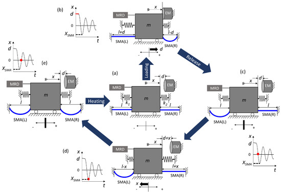 The operation cycle of this experiment is illustrated in Figure 9. Initially, the mass is kept at a distance of d from the electromagnet (a). The shock loading is provided by activating the electromagnet (b), whereby the mass is pulled, with an initial displacement of d. Under this condition, the SMA (L) together with springs on the left side is elongated by the displacement d. At the other side of the mass, the SMA (R) undergoes buckling owing to lack of compressive stress in the foil. The springs on the right side are compressed. When the electromagnet is deactivated, the mass begins to oscillate about the initial neutral position. The MR damper is activated at the same time instant when the electromagnet is deactivated. When the mass reaches the neutral position for the first time (c), the SMA (L) undergoes buckling owing to the residual strain after shock loading. The mass movement starting from this neutral position in the negative x-direction results in loading of the SMA (R) until , as shown in (d). When the mass reaches the neutral position for the second time, both SMA devices are in buckled condition (e) owing to the residual strain. Thereafter, the SMA bridges do not take part in further dissipation. However, the SMA bridges contribute to energy dissipation in this first cycle through martensite reorientation (see Figure 1) starting from the beginning of the shock occurrence. The SMA undergoes shape recovery and returns to its neutral state (a) when a heating pulse is applied.