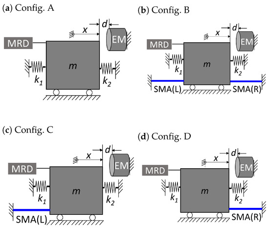 An overview of test configurations investigated in this research is shown in Figure 10. The initial test focuses on identifying the best damper configuration among four configurations, named ‘Config. A to D’, based on their suppression of free oscillations after shock loading. The shock damping performance of the MR damper alone is studied as ‘Config. A’. The effect of the MR combined with SMA damper devices at both sides of the mass is investigated as ‘Config B’. The contribution of the left and right side SMA damper are individually studied as ‘Config. C’ and ‘Config. D’, respectively.
