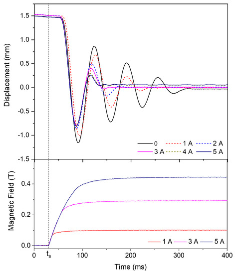 As can be seen in the above table, the shock loading amplitude d results in the SMA loading amplitudes in the first overshoot (see Figure 9). The SMA damper contributes to the dissipation during the first overshoot, as mentioned in Section 4.1. By increasing the SMA loading amplitude, more energy is dissipated in the first cycle of oscillation, resulting in the reduction of the excitation current of the MR damper. This equivalent current, represented as in the above table, is the excitation current that is needed to achieve a similar damping performance from the MR damper with 5 A excitation current (see Figure 11). With the maximum loading of 2.0 mm for the SMA, the MR damper requires an excitation current of only 1 A, thereby achieving a of 96% for the MR damper. Using this hybrid configuration, the MR damper can be used to reduce the subsequent vibrations after energy dissipation by the SMA. This indicates the potential of miniaturizing the MR damper in real applications.