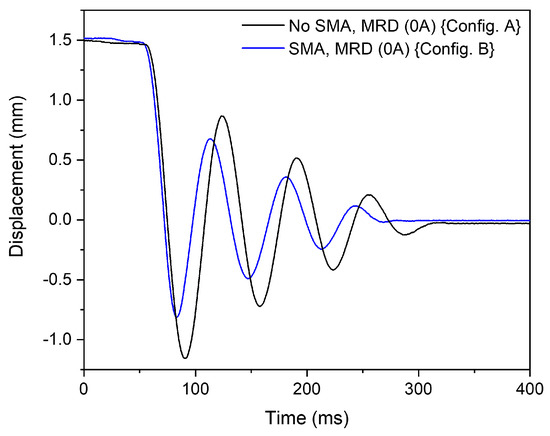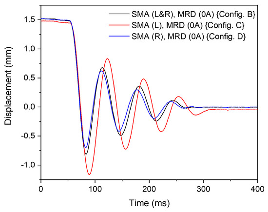 The effect of the SMA damper alone on shock damping is estimated using ‘Config. A’ and ‘Config. B’. Here, the MR damper is not electrically activated. The resulting system response is shown in Figure 12. By inserting the SMA dampers SMA (R) and SMA (L), the oscillation amplitudes is reduced owing to the energy dissipated by the SMA damper. There is a slight increase in the stiffness of the system due to the presence of the SMA damper. The number of oscillations before the vibrational system settles down remains almost identical for both configurations. This implies that the SMA damper is not effective in damping the oscillations from the second overshoot due to the buckling of the SMA damper device.