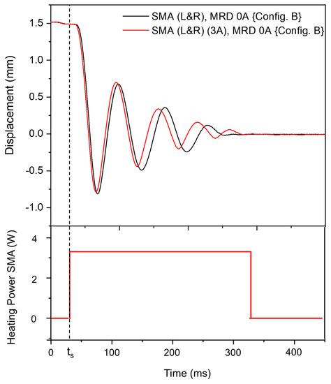 Thus far, SMA damper is used only in passive mode during shock loading. The impact of phase transformation to austenite upon application of a heating pulse to the SMA damper is investigated using ‘Config. B’, and is shown in Figure 13. A heating pulse of 3.3 W for 300 ms is applied at upon mass release from the electromagnet. At this heating pulse, the maximum temperature exerted on the SMA damper rises to 80 C, meaning that more than 90% of the bridge is above the austenite finishing temperature of 59 C. The SMA device is expected to generate a high recovery force at this point due to the phase transformation, which could potentially reduce the oscillation amplitude and improve the settling time. However, it is observed in this experiment that the heating pulse does not improve the damping behavior. Apparently, 300 ms is too long a pulse duration to initiate the effect of he phase transformation within the first few oscillations. A further increase in the heating current to enable phase transformation does not seem to be a viable approach for this combinational SMA-MR damper, as the target is to reduce the current requirement. Therefore, material dissipation using the martensite orientation alone is available for the damping of shock loading energy. However, a heating pulse is inevitable to enable strain recovery in the SMA damper (see Figure 9). This adds to the total energy consumption of the hybrid damper. Here, the phase transformation to austenite is achieved using a slower current pulse of 1 s at 1.2 A after shock loading.
