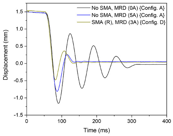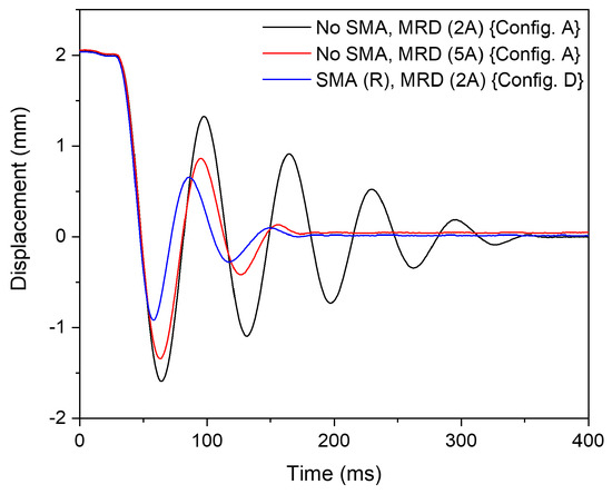 To determine the trend of SMA-MR damping behaviour, a shock load of 2 mm is applied. The system response is illustrated in Figure 16. Evidently, ‘Config. D’ shows significant reduction in oscillation amplitude and settling time. By increasing the shock loading amplitude, the SMA damper can be loaded to a higher deformation strain, thereby dissipating more energy within the loading cycle. This implies that the excitation of the MR damper can be further reduced at this shock load condition.